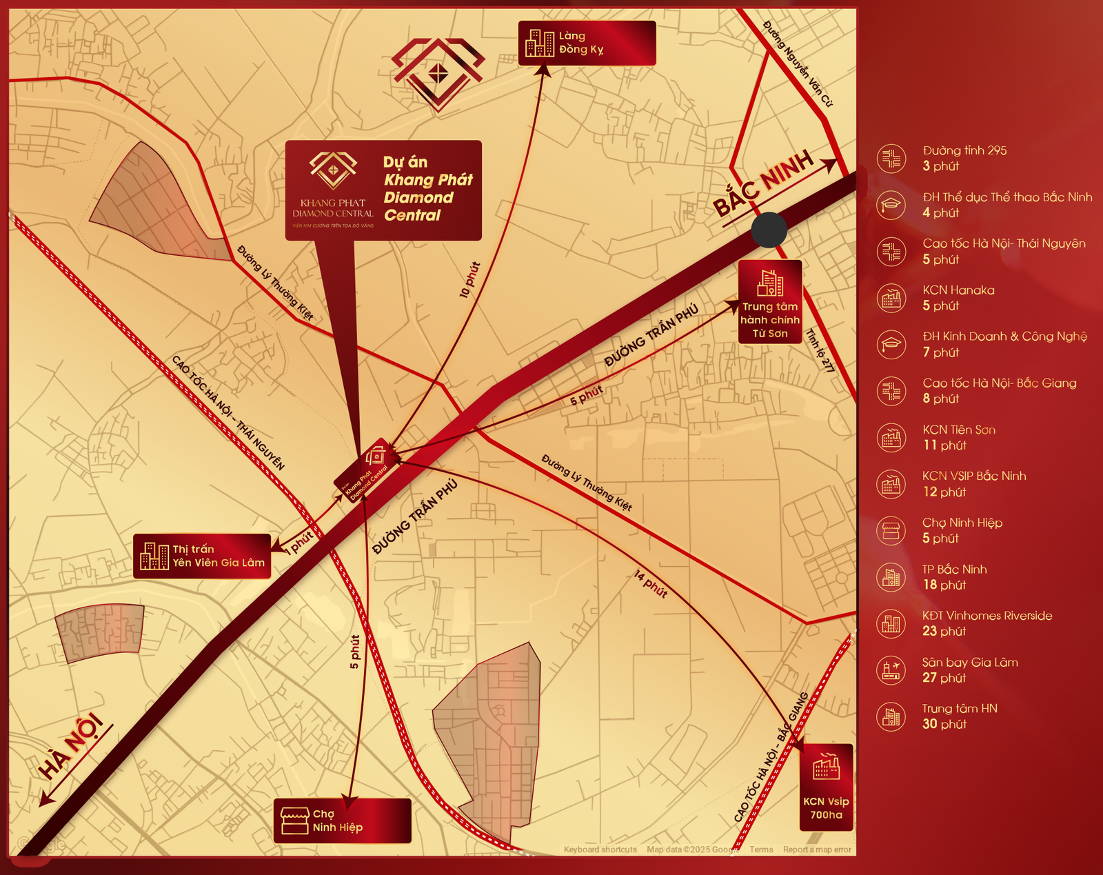 Toạ lạc đường Trần Phú – tuyến đường huyết mạch của Thành phố Từ Sơn kết nối các khu vực trung tâm hành chính, thương mại và khu dân cư, là cửa ngõ giao thương kết nối với TP Bắc Ninh và Hà Nội, bao quanh bởi các trục đường giao thông quốc lộ lớn nối liền các trung tâm kinh tế, văn hoá và thương mại của phía Bắc như tuyến QL 1A, QL 1B (cao tốc Hà Nội – Bắc Giang), TL 295B, TL 277